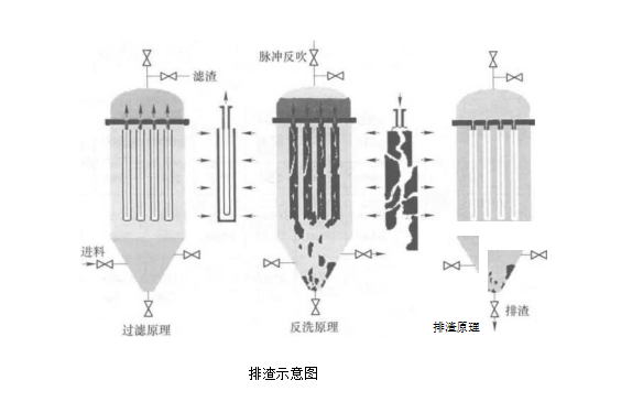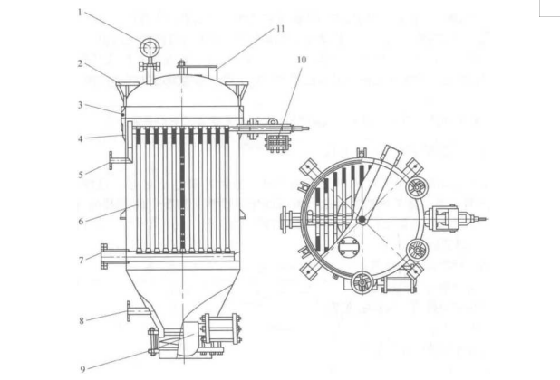 振动排渣立式叶滤机由罐体,罐盖,提升机构,振动器,滤片,气动蝶阀,压力表等组成.