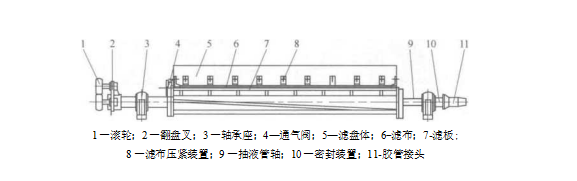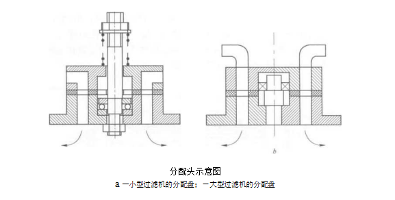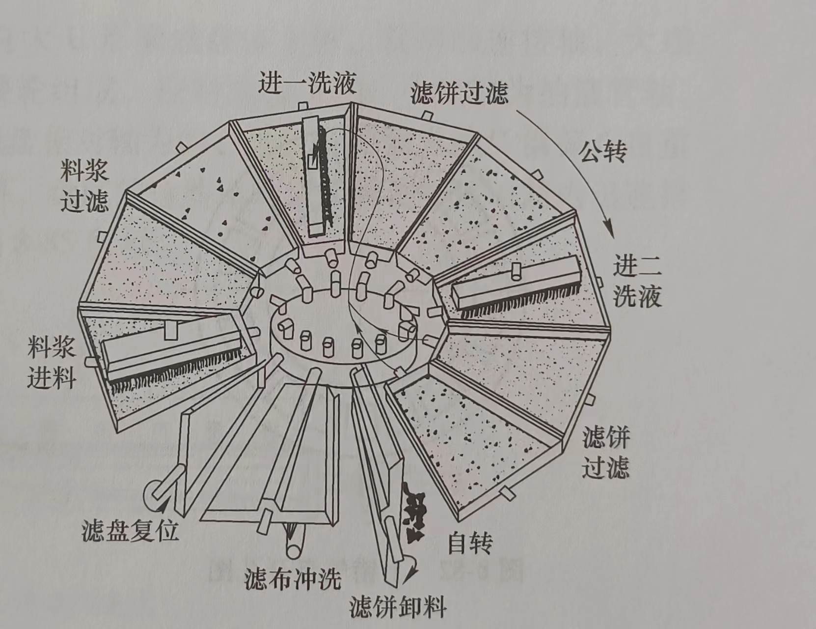 将翻盘真空过滤机展开成平面图形,通过展开的平面原理图可以更醒目地了解其工作原理:过滤机的每个滤盘小端部都通过吸酸胶管与中心分配头的上错气盘各孔——对应相通,并与之同步水平回转