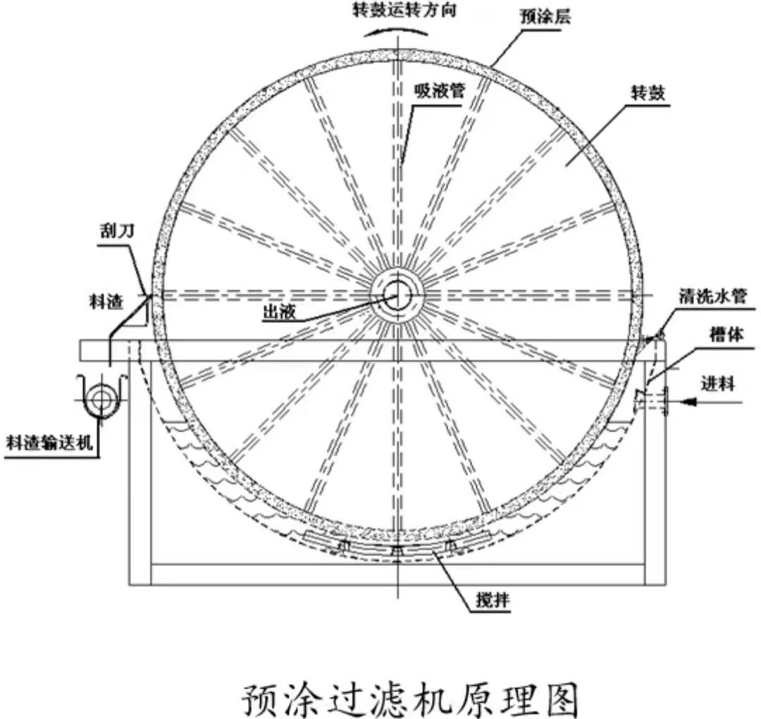 预涂层转鼓真空过滤机是近年来从国外引进的新机型.其原理是,将原转鼓真空过滤机有格改为无格,滤布外吸附助滤剂硅藻土进行过滤,当滤渣阻碍过滤,真空度增到一定数值后,刮刀自动进刀0.2mm左右将物料刮下,使滤面常新,连续过滤....