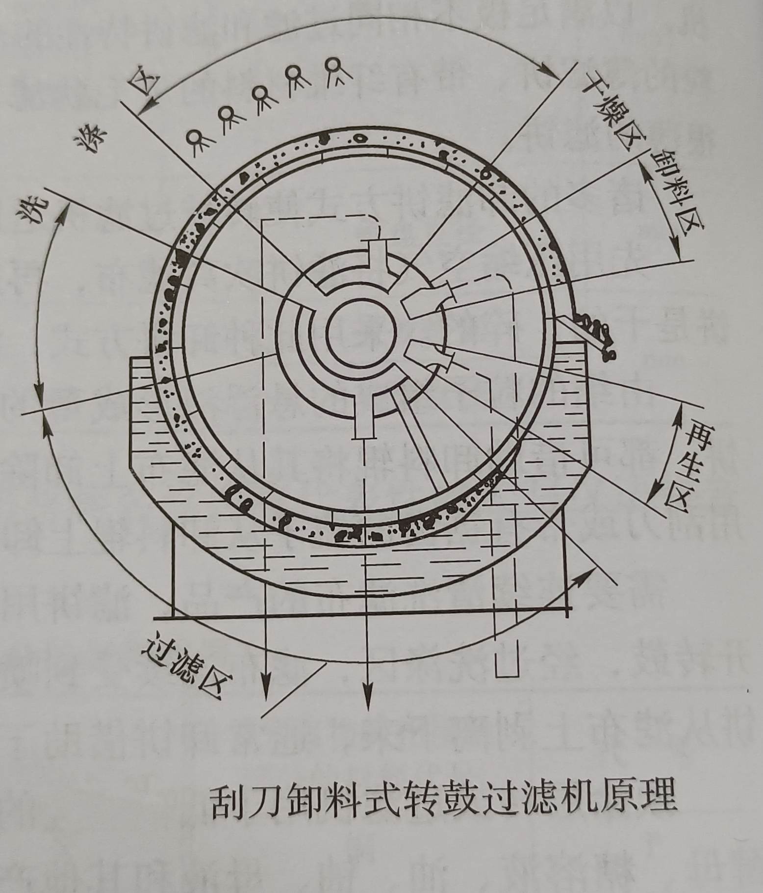 刮刀卸料式转鼓真空过滤机的主要部件包括水平放置的转鼓,料浆槽,搅拌器,分配头也称为,切换阀,转皱的表面,圆周面,镶有若干块长方形的筛板,在筛板上顺次铺有金属网和滤布.