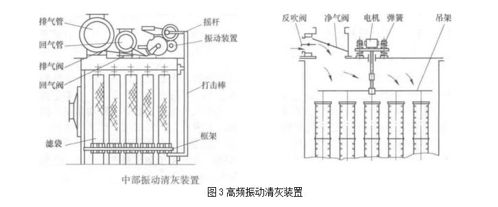 高频振动清灰装置以带有偏心轮的电机为动力,电机安装在滤袋吊架的顶部,而吊架支撑在弹簧上(图3)。电机开动时带动吊架振动,其频率很高,而振幅很小,滤袋随之振动,将滤袋表面的粉尘清落。同时,净气出口阀和反吹阀相互切换,室外空气或净化后的气体反向通过滤袋,增强清灰效果。该方式要求除尘器取分室结构,逐室轮流清灰。