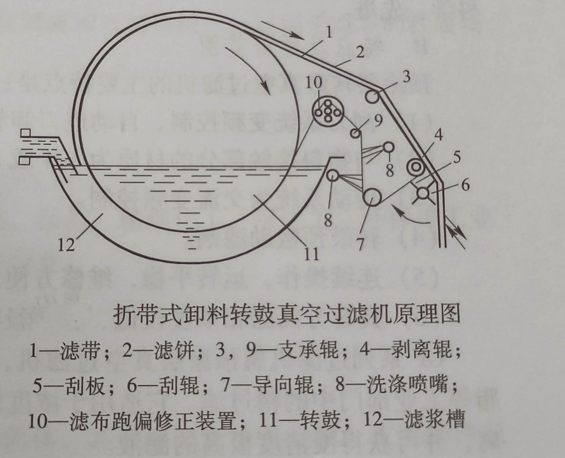 带在转鼓的带动下一起循环转动,因而在转动过程中,有时和转鼓接触,有时则离开转鼓面.滤带由卸料辊及导向辊支承,并设有防止滤布跑偏的装置.