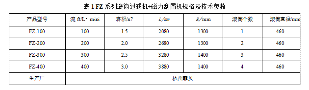 FZ系列滚筒过滤机+磁力刮屑机规格及技术参数见表1