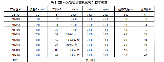 ZB系列磁棒过滤机规格及技术参数见表1。
