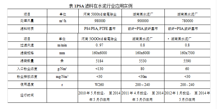 现已批量生产包括细旦芳砚纶纤维在内的纤维和滤料产品,并用于水泥窑尾烟气除尘 和钢铁行业,获得良好效果。表1为PSA复合滤料用于水泥窑烟气除尘的情况。