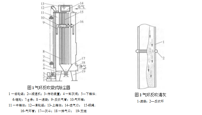 气环反吹袋式除尘器滤袋清灰依靠气环反吹装置进行,该装置的核心是气环箱,箱内为每条滤袋配置一个铝合金气环套在滤袋外面.