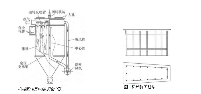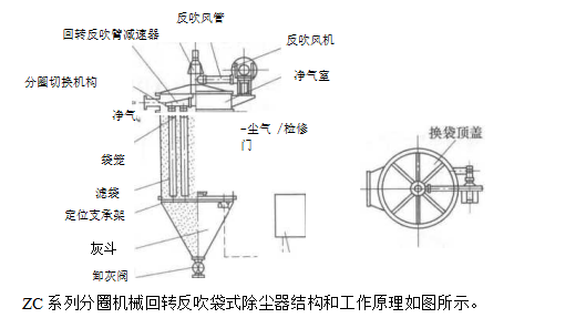 反吹风清灰装置:包括回转反吹臂,反吹口,分圈切换机构,循环风管,反吹风管,反吹风机,减速器.
