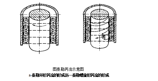运转时,滤浆不断被泵入由旋转圆筒和静止圆筒所围成的滤室内,并使之保持充满状态。旋转的圆筒使介质上的滤渣受到剪切扫流作用,从而实现薄饼层下的过滤浓缩。滤室内牛顿流体的流动状 态取决于圆筒的转速,当转速超过某极限值时,便在滤室中产生称之为泰勒(G.I. Taylor)涡流的环状涡流,该涡流分布在转筒的周围,其宽度等于内筒和外筒所围成的间隙。相邻的泰勒涡流具有相反的旋转方向,虽然在涡内 有剧烈的混合现象存在,但涡间的混合却较少。当 滤浆沿滤室的轴向以一定速度流动时,泰勒涡流便 呈螺旋状连接起来,并一边绕内筒旋转,一边沿轴向移动,由于泰勒涡流阻止了轴向液流的逆流和短路,因此内、外圆筒间的液流为理想的柱状流。又由于泰勒涡流的剪切作用,使滤渣从介质上被扫流掉,因此才得以实现薄饼层下的过滤浓缩。